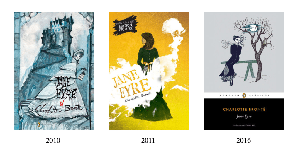 A noticeable shift occurs in 2009 in the Penguin editions: the cover art evolves from portraiture to typography and illustration. There is admittedly a marketing factor at play (i.e., some of these covers exist within a series of classic texts and the 2011 edition promotes the movie adaptation that came out that same year). However, this change in cover art also reveals a shift in the way publishers and readers perceive Brontë’s story. For instance, since 2010, there have been three representations of Jane on the cover (Figure 3). No longer is Jane imagined as occupying domestic space. In the 2010 and 2016 editions, Jane is outside[1]. In this sense, modern marketers give Jane more mobility, as do many modern readers who see Jane as an early feminist.